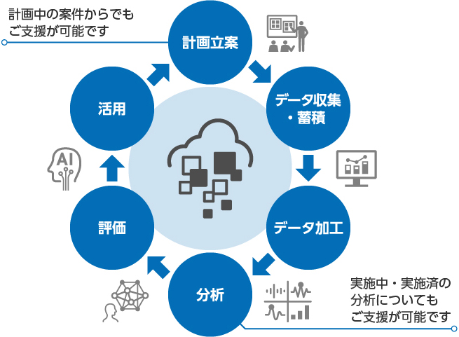 ![[データ活用のサイクル]計画立案→データ収集・蓄積→データ加工→分析→評価→活用→計画立案。計画立案では、計画中の案件からでもご支援が可能です。また、分析につきましては、実施中・実施済の分析についてもご支援が可能です。](/service/data-driven/images/img_data-driven01.jpg)